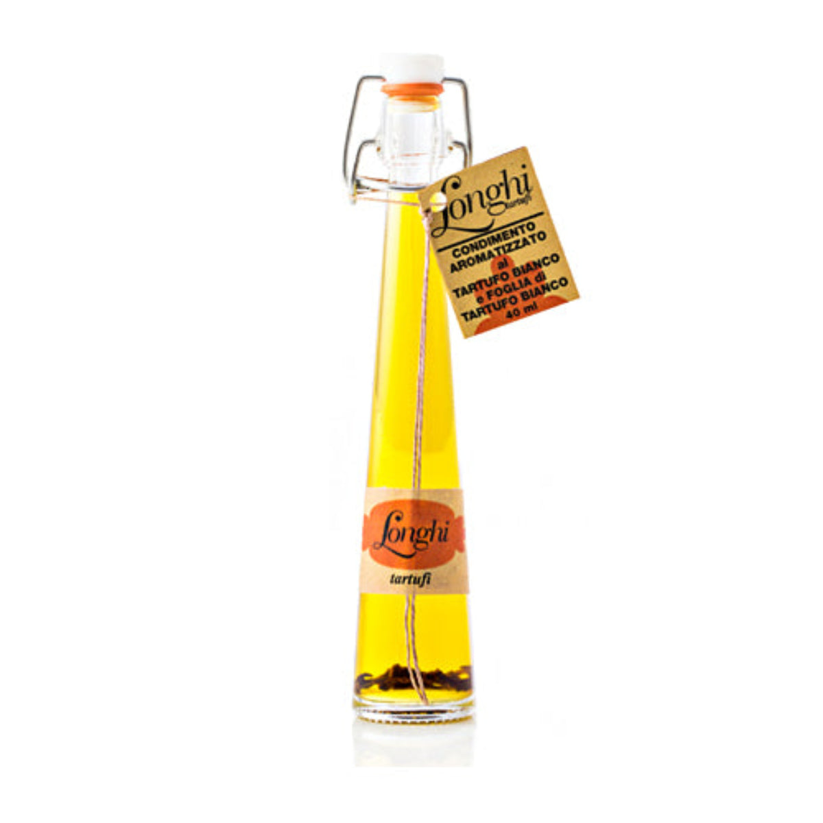 È un olio di alta qualità infuso con l'aroma del tartufo bianco, con l'aggiunta di una vera foglia per un effetto visivo e gustativo.